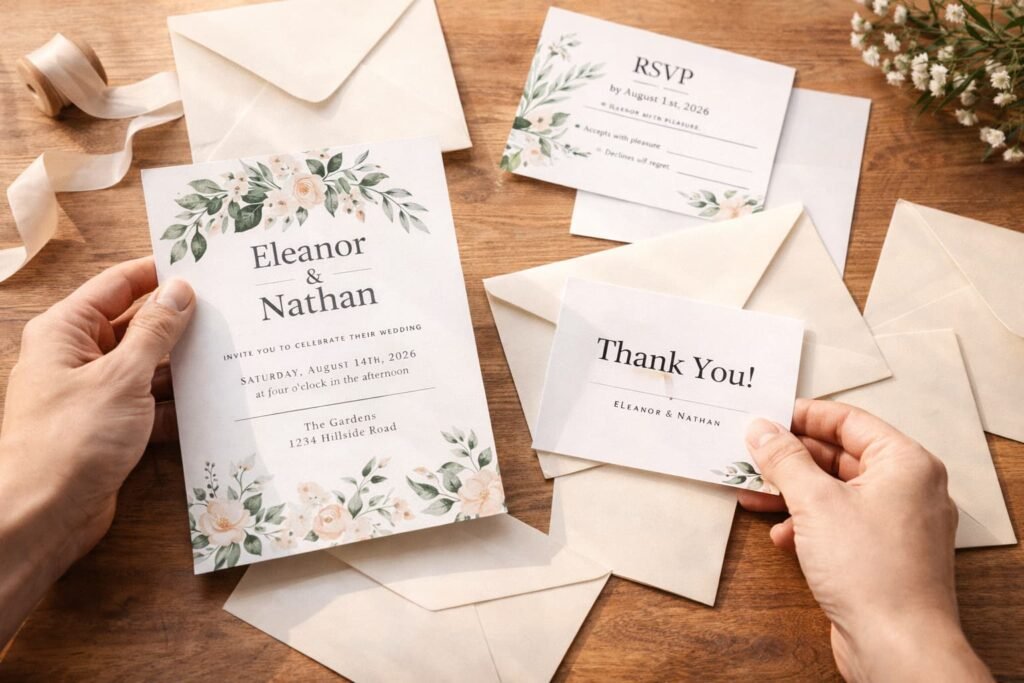 A simple suite usually includes: invitation, RSVP card, thank-you card, and a welcome sign. That’s enough to feel complete without making the product harder to create.