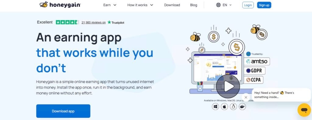 Honeygain is one of the most established names here, and it’s simple. Install it, run it in the background, and cash out once you hit the threshold. It’s popular because it’s straightforward and doesn’t require constant interaction. The downside is that it can feel slow depending on where you live — and the payout threshold can take time to reach if demand is low in your area.